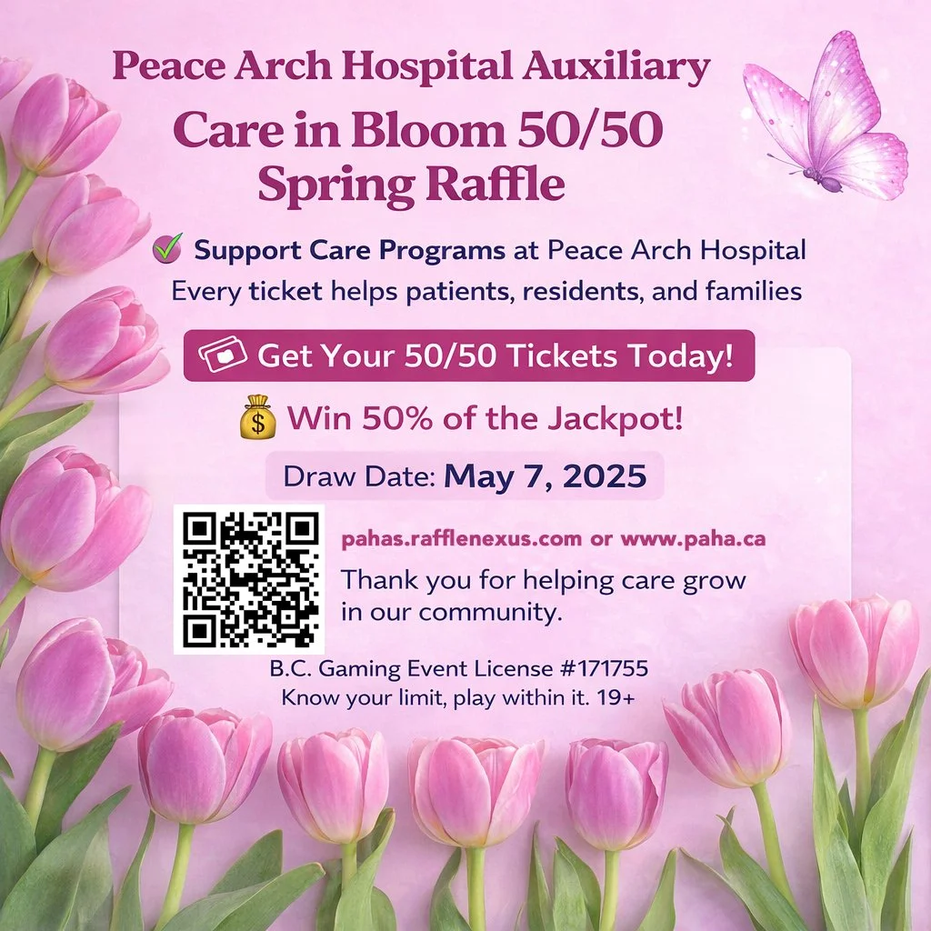 This special fundraiser, led by the Peace Arch Hospital Auxiliary, helps support vital care programs that benefit patients, residents and families right here in our Community. Every ticket purchased helps us continue providing comfort, care and essential services.