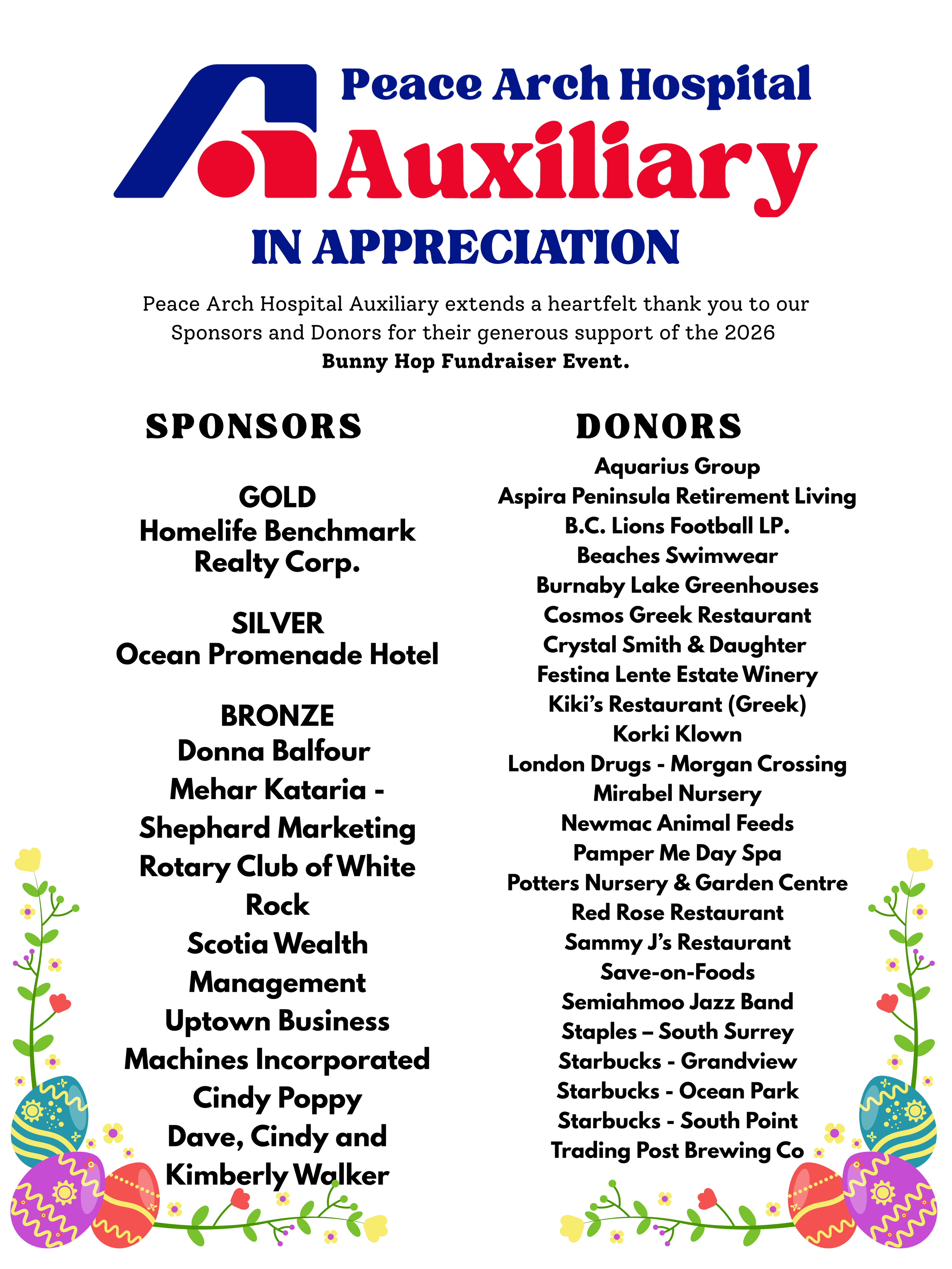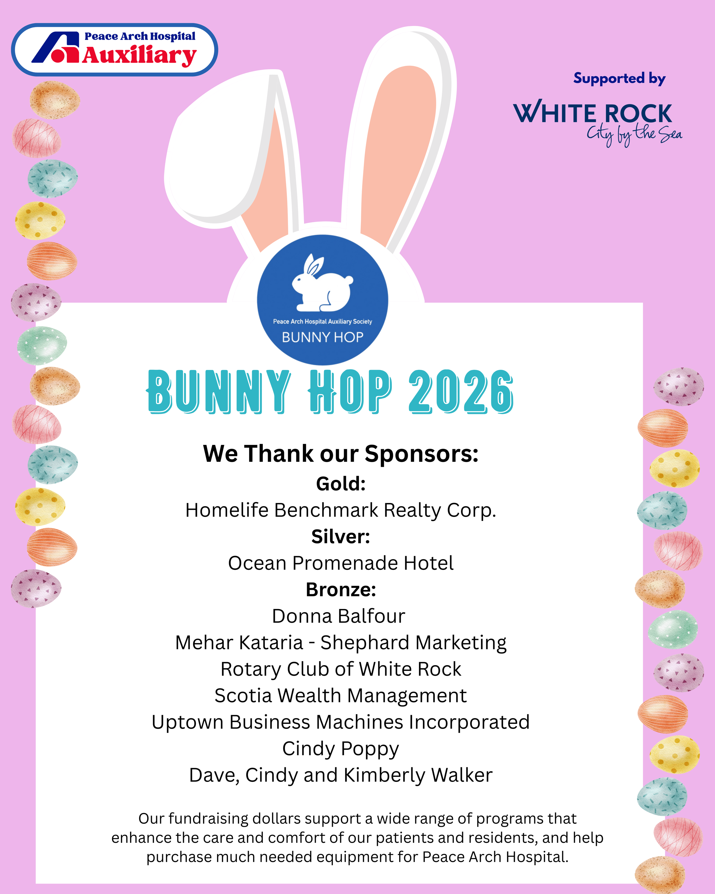 The Peace Arch Hospital Auxiliary would like to thank everyone who came to the 6th Annual Bunny Hop on Friday, April 3, 2026. It was a great day with just a few drops of rain at the start but that didn’t dampen the spirits of all the children with their beautifully decorated hats. A huge thank you to all the volunteers who came out to help, and also to our generous Sponsors and Donors - we just couldn’t hold this event without your support. Over 600 people attended our event this year. Hope to see you all next year!
