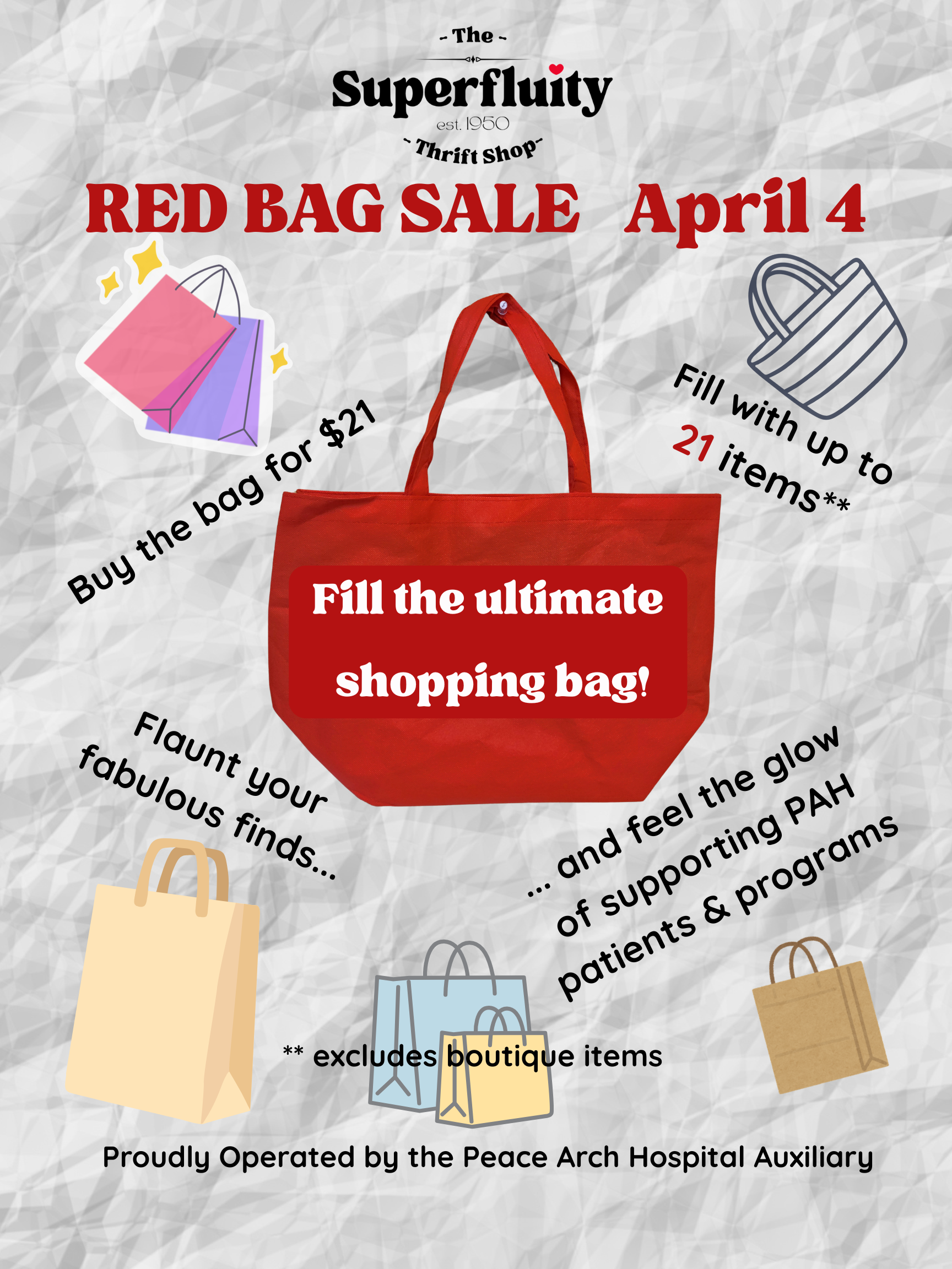 Back to All Events Superfluity RED BAG Sale Saturday, April 4, 2026 10:00 a.m. 4:00 p.m. Superfluity Thrift Store 15163 Prospect Avenue White Rock, BC, V4B 2B8 Canada (map) Google Calendar ICS
