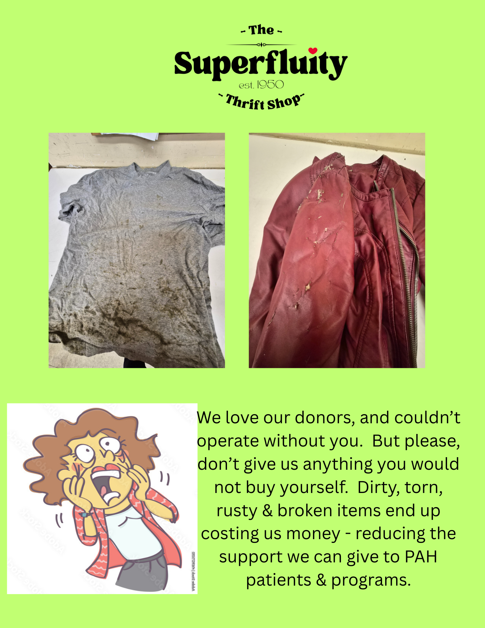 As a staple of generosity and giving in the community, it is vital that we maintain a standard of the merchandise. Before donating, please think “would I buy this?” We are strict about what we accept in order to keep the shop valuable to our community.